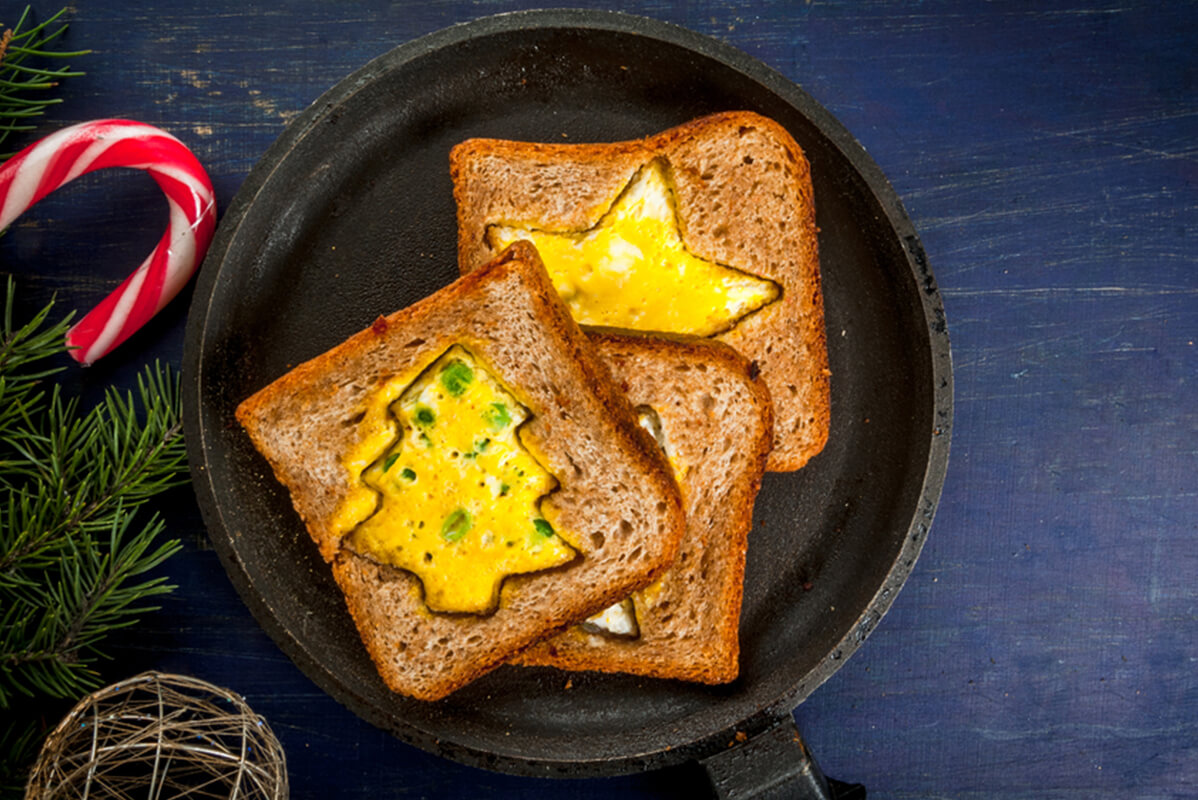 - En una cacerola pon a dorar el pan con un poquito de mantequilla, cuando esté doradito por un lado dale la vuelta y pon un poco de la mezcla de huevos en el hueco que queda del molde en el pan.